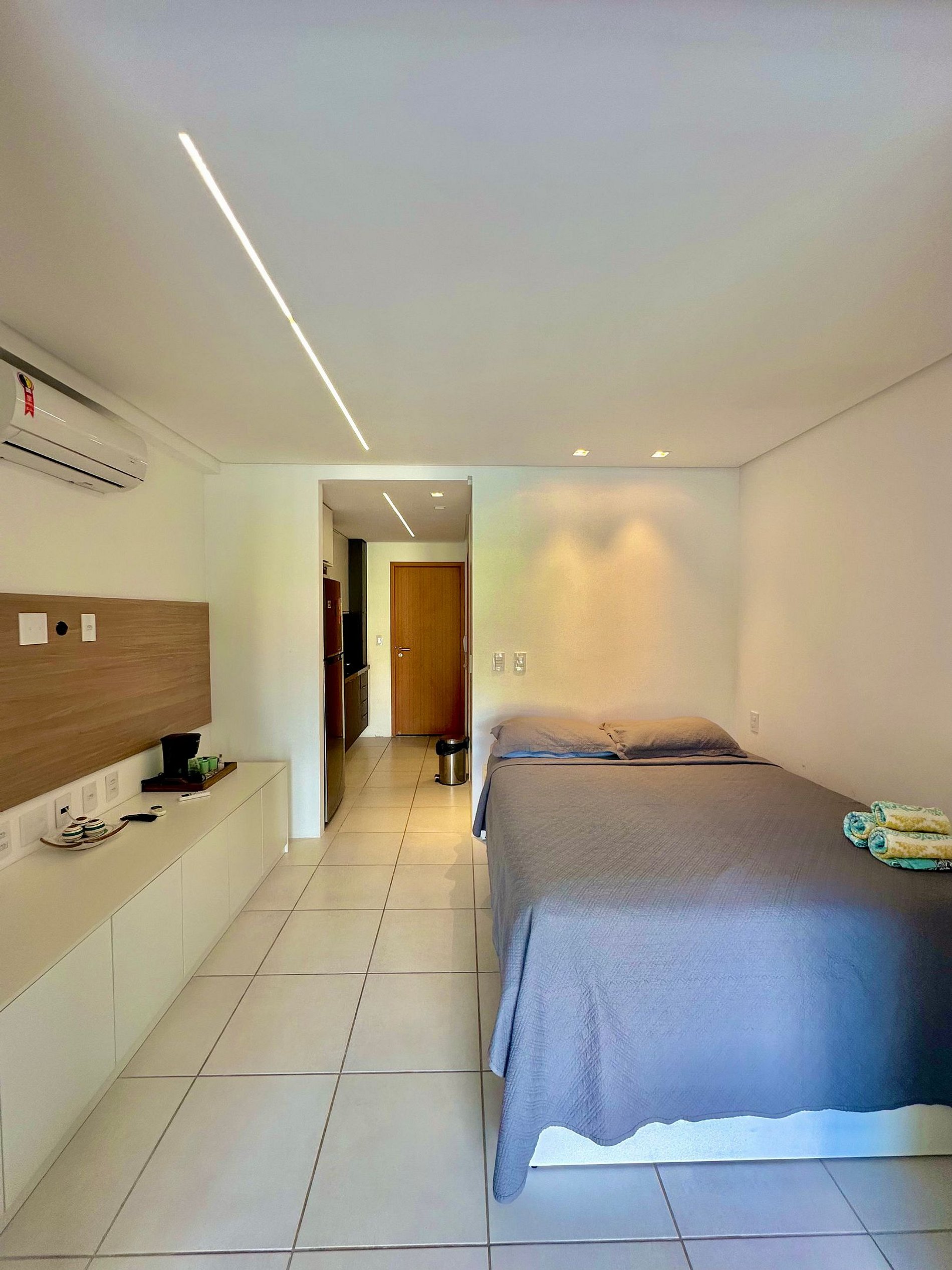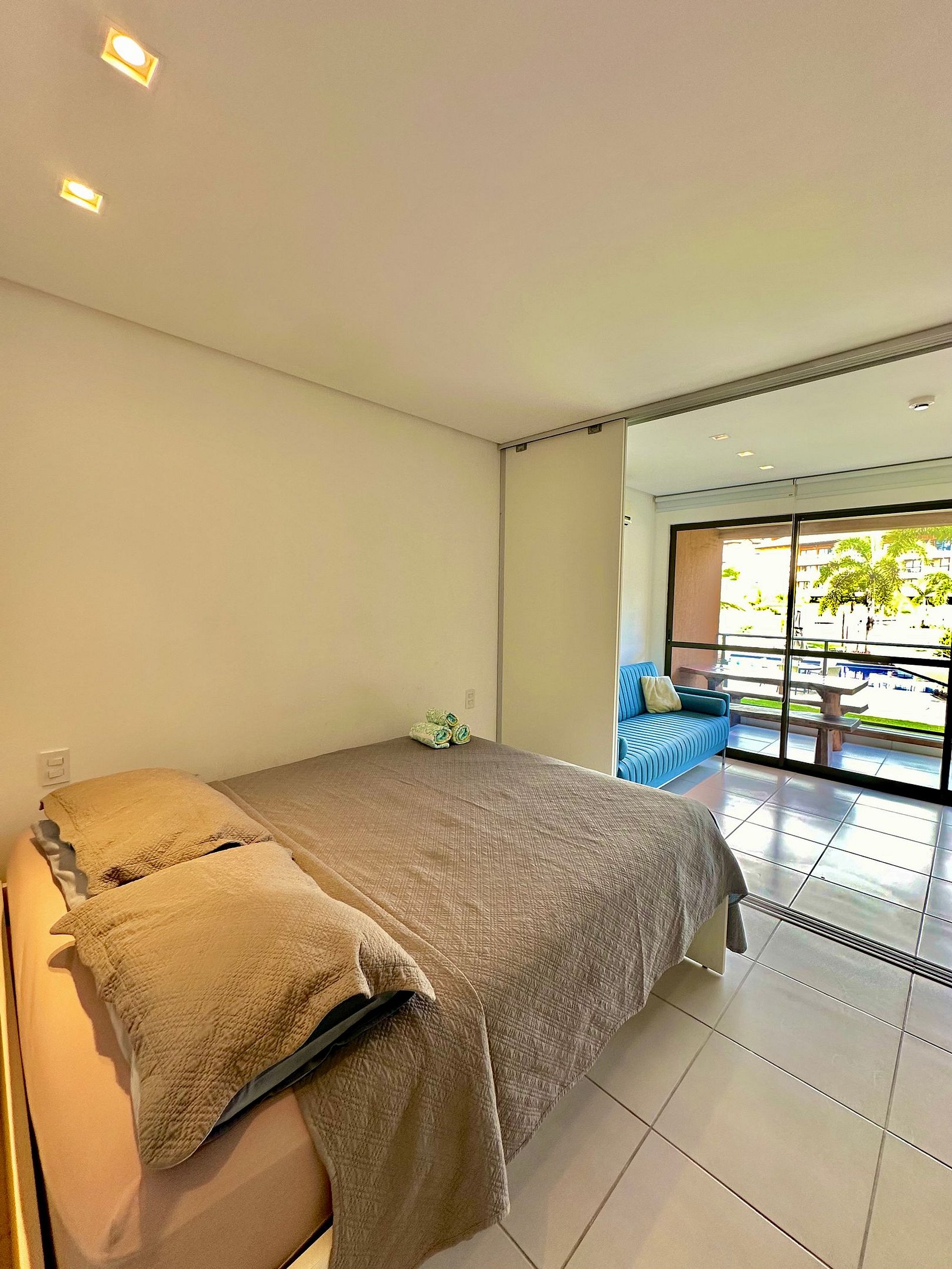 Flat studio de 38 m² no primeiro andar com capacidade para 4 pessoas. Possui cama de casal com cama auxiliar e sofá cama. Ainda possui cozinha equipada, enxoval completo e ambiente climatizado. Vista piscina.