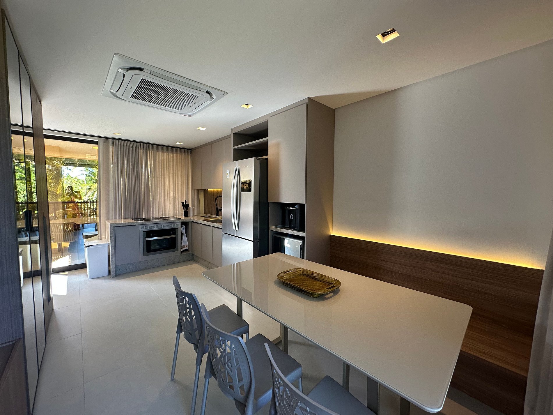 O Amura tem um conceito ultramoderno, uma linguagem muito concreta com referências fortes em ter a madeira como acabamento permanente no nosso projeto. Uma leitura contemporânea, linhas retas, quebrando com aquela estética importada de praia que todos fazem, indo além do que se espera de um empreendimento na Praia dos Carneiros.