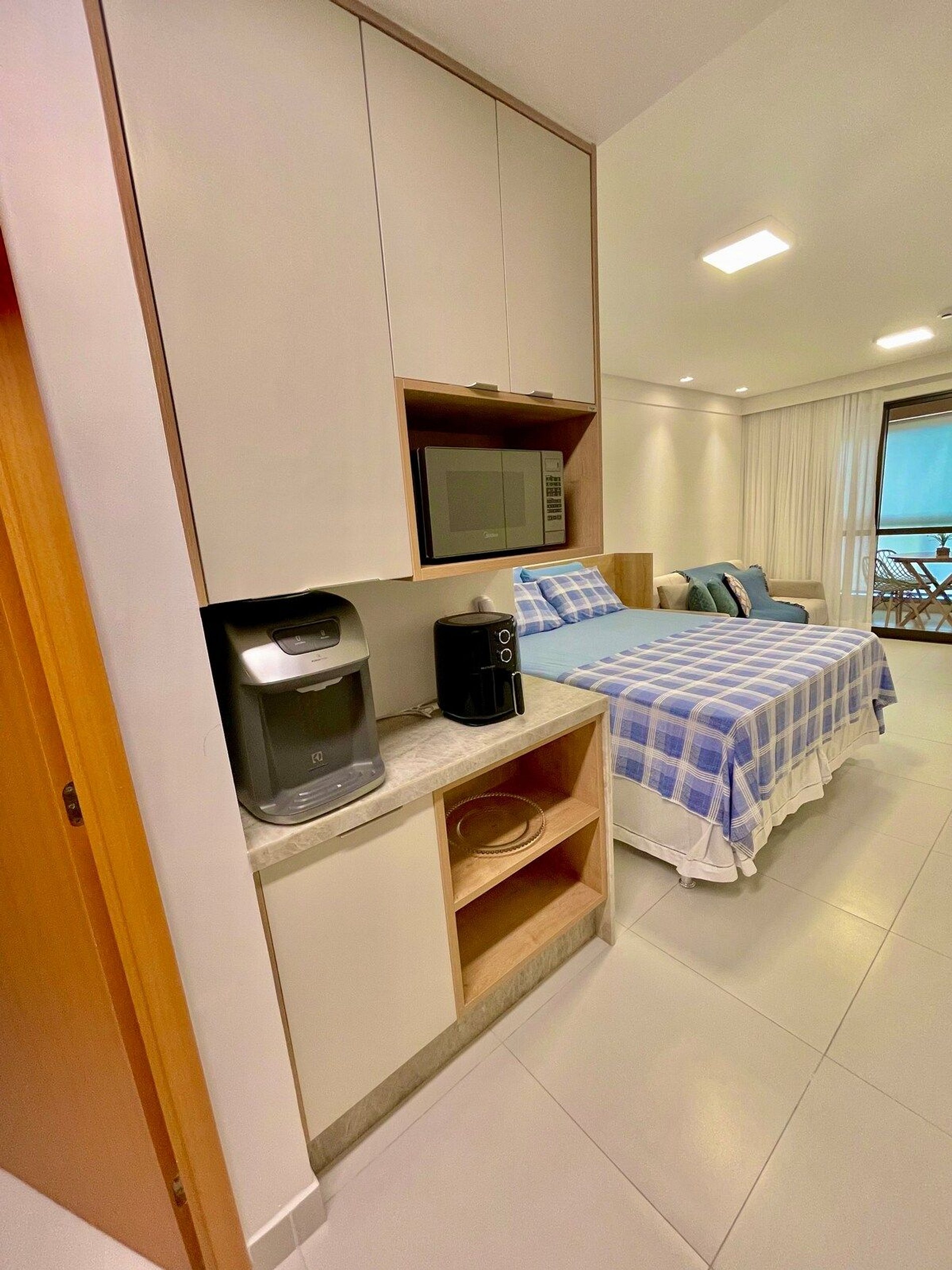 Flat studio de 38 m² no primeiro andar, com capacidade para 4 pessoas. Possui cama de casal e sofá cama. Além disso, possui varanda gourmet com churrasqueira, cozinha equipada, enxoval completo e ambiente climatizado. Sem vista.