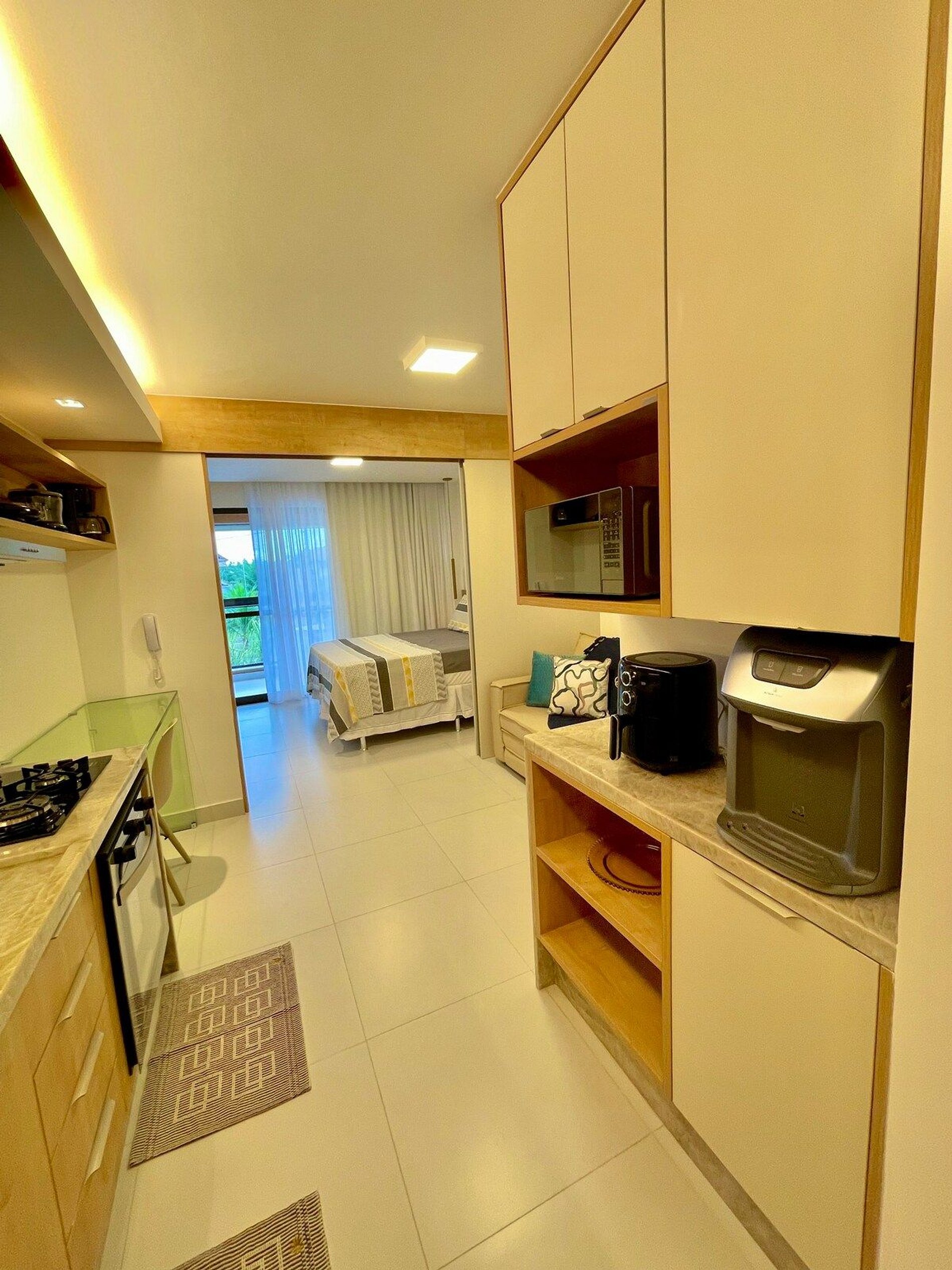 Flat studio de 38 m² no primeiro andar com capacidade para 4 pessoas. Possui cama de casal e sofá cama. Além disso, possui varanda gourmet com churrasqueira, cozinha equipada, enxoval completo e ambiente climatizado. Sem vista.