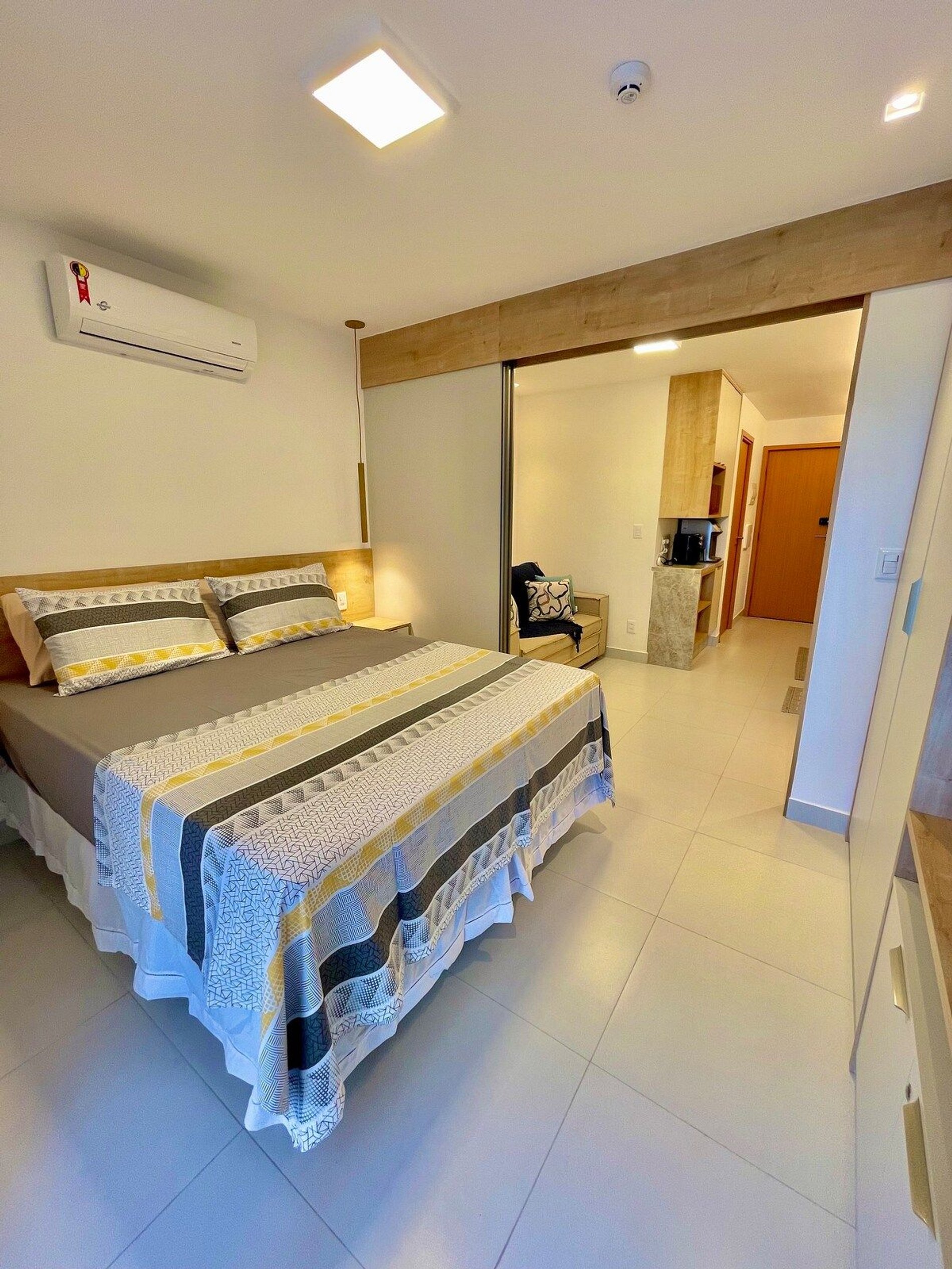 Flat studio de 38 m² no primeiro andar com capacidade para 4 pessoas. Possui cama de casal e sofá cama. Além disso, possui varanda gourmet com churrasqueira, cozinha equipada, enxoval completo e ambiente climatizado. Sem vista.